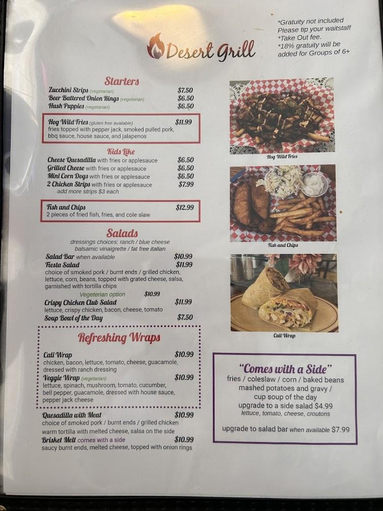 Desert Grill’s menu is a delightful mix of traditional comfort food and local favorites. Starters include crispy zucchini strips and onion rings, perfect for sharing. For those craving something lighter, the chicken mandarin salad offers fresh flavors that refresh. Sandwiches remain a highlight, especially the pulled pork and brisket options.